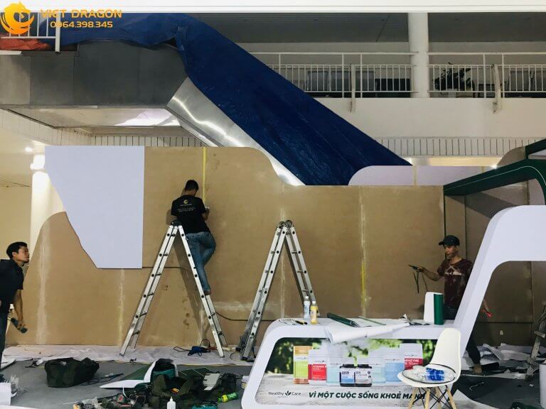 Không chỉ cung cấp dịch vụ thiết kế gian hàng tiêu chuẩn, Viet Dragon còn hỗ trợ thi công trọn gói, quản lý dự án toàn diện từ khâu lên ý tưởng, dựng mô hình 3D, sản xuất các hạng mục, lắp đặt và bàn giao. Dịch vụ đồng bộ giúp khách hàng tiết kiệm thời gian, công sức và chi phí.
